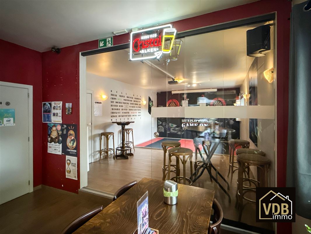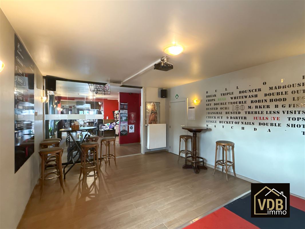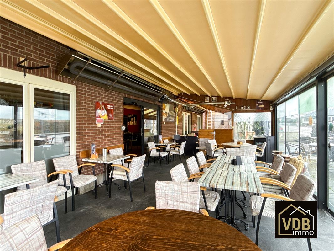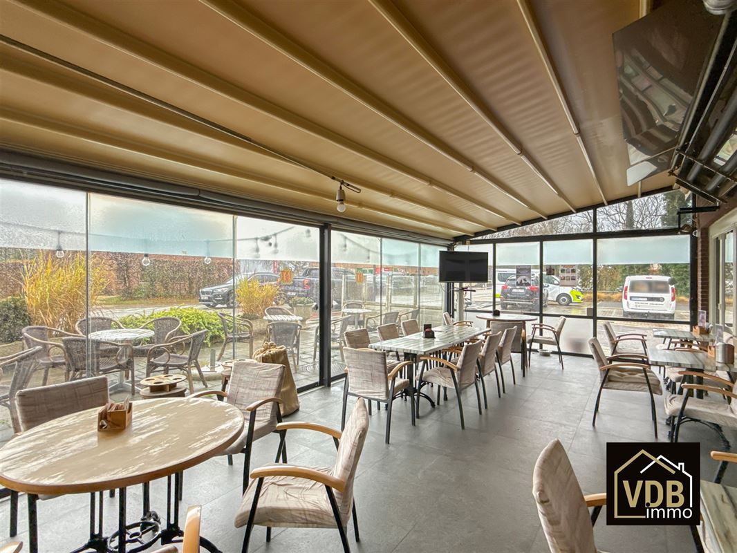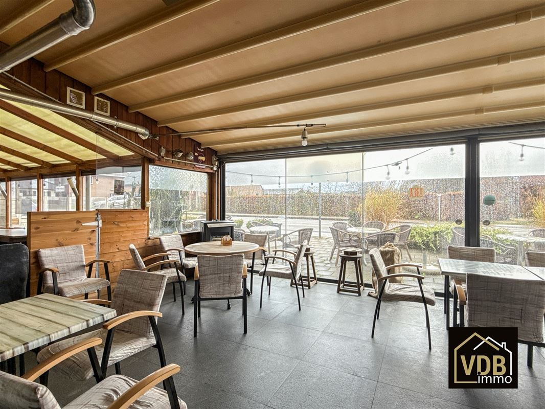Het café met vele zitplaatsen en uitbouw – terras is goed in orde, gekend bij de bevolking en een fijne plaats om te vertoeven, te kaarten, te darten …., kortom te ontspannen. Deze gelijkvloerse verdieping bedraagt 221,71 m² inclusief terras – veranda.