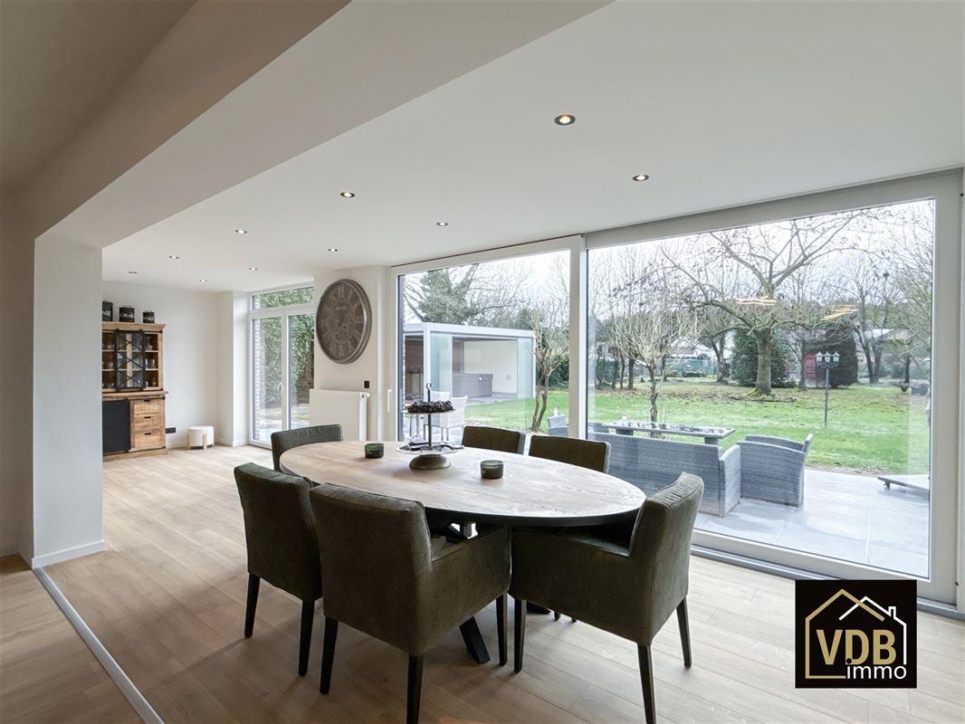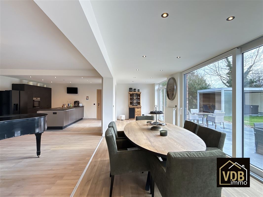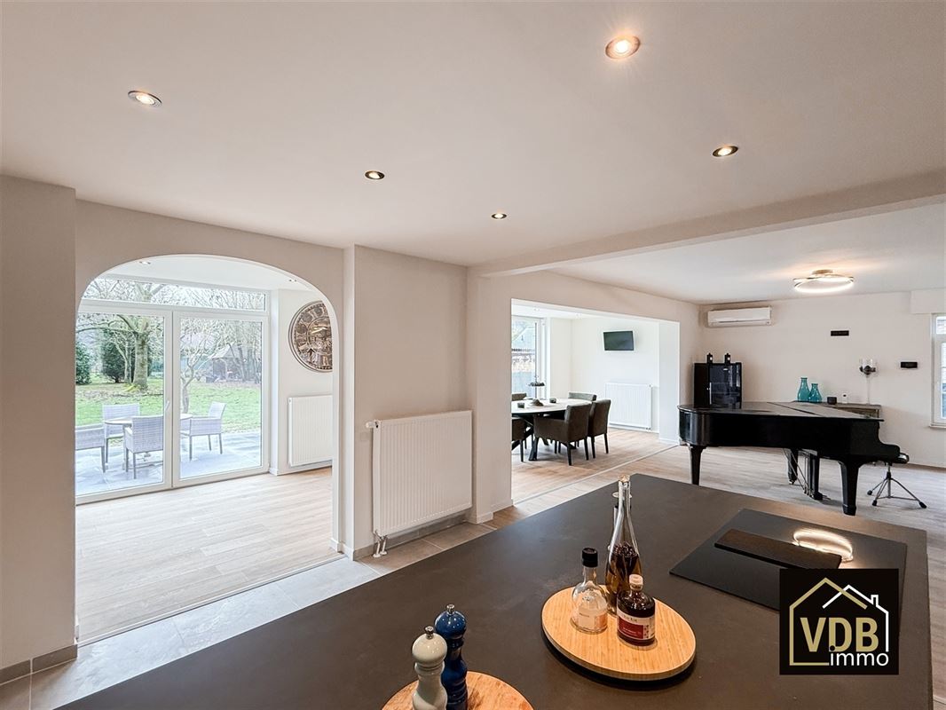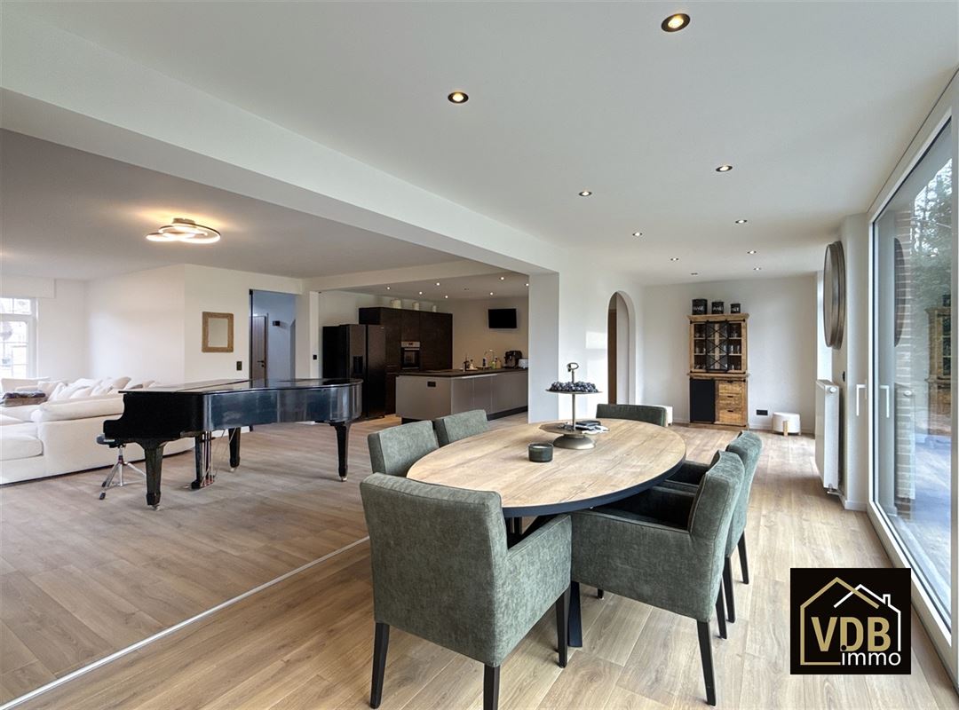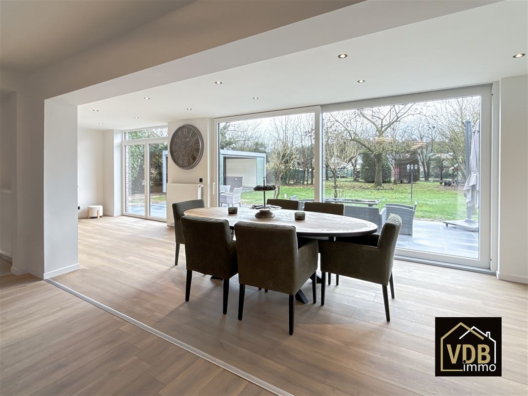 De gelijkvloerse verdieping is gezellig, licht, zeer ruim. De uiterst grote raampartijen met schuifpui laten je meteen genieten van het bijzonder uitzicht op de tuin. De aansluitende - open keuken met eiland is comfortabel en voorzien van alle toestellen en sluit perfect aan bij de leefruimte (samen bruto +- 97 m²) en de geweldige tuin – terras– paviljoen. Een eerste zeer goed uitgeruste badkamer met inloopdouche en dubbele wasbak bevindt zich tussen de keuken en de inpandige garage. Het bureau (eventueel slaapkamer) en het gastentoilet is gelegen bij de inkomhal.