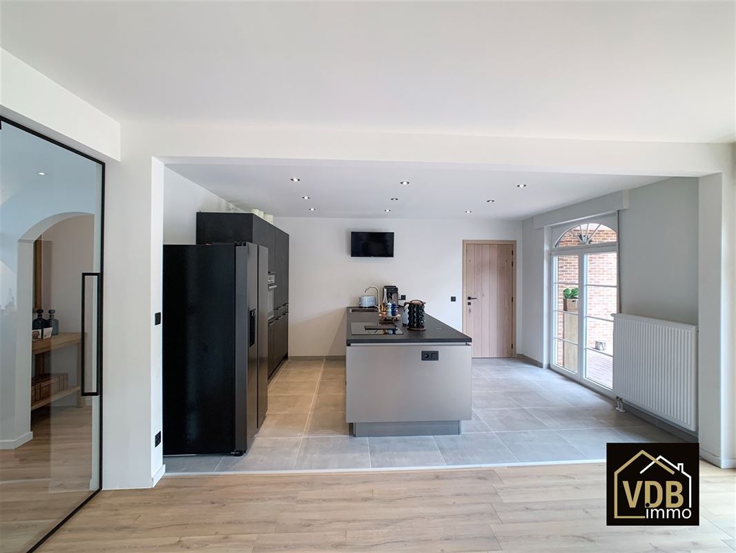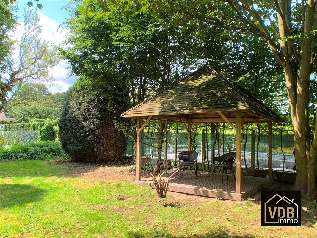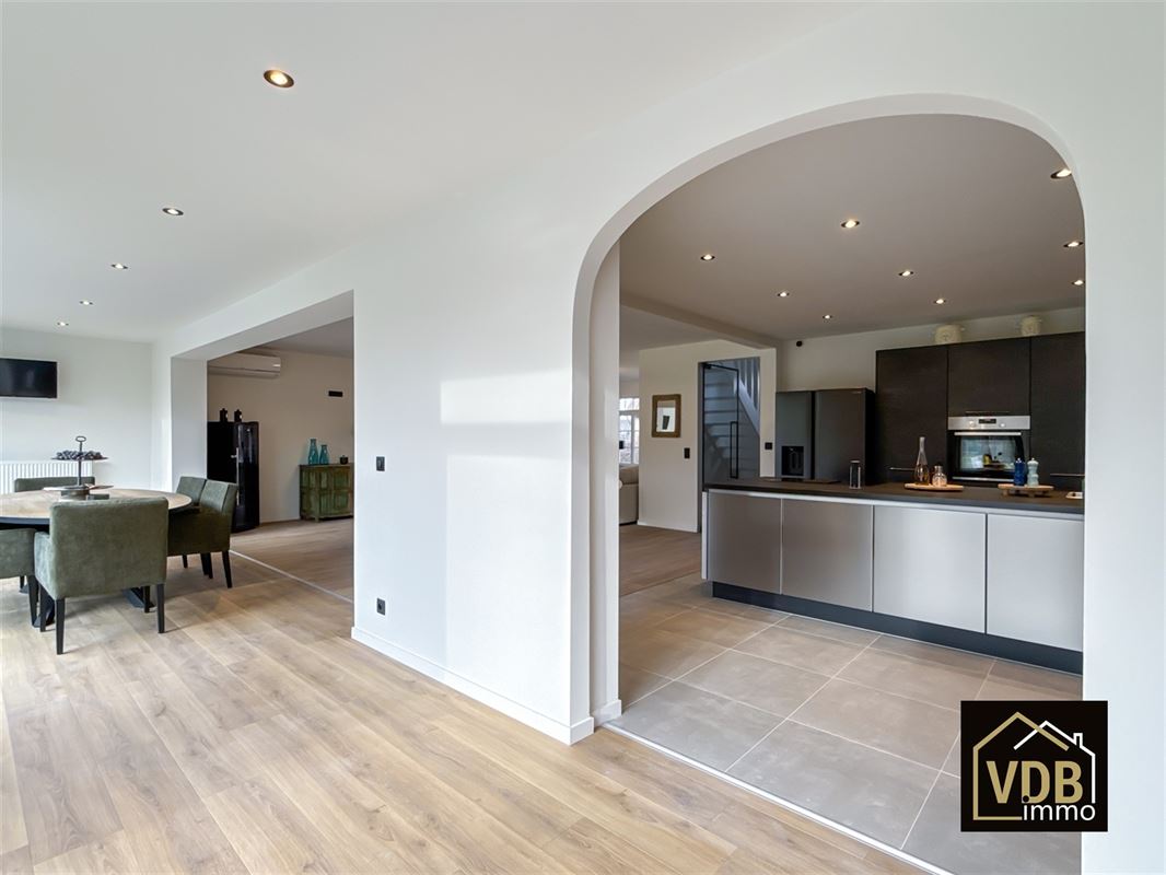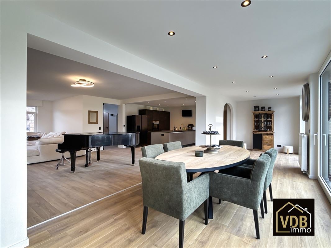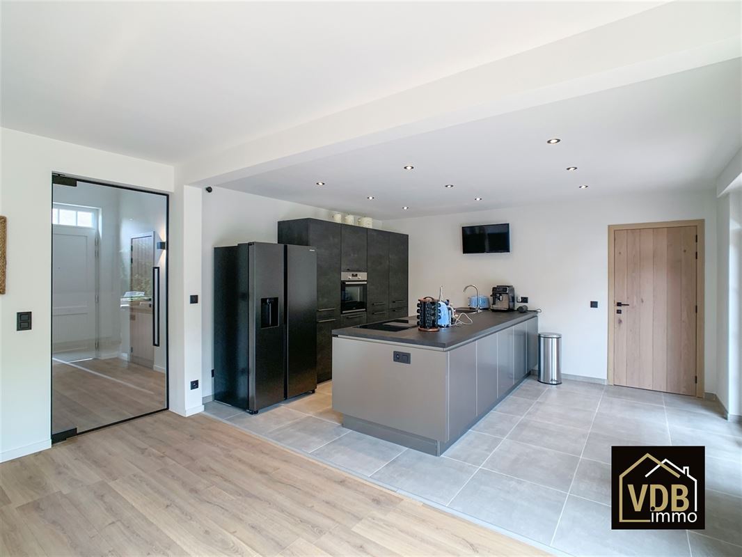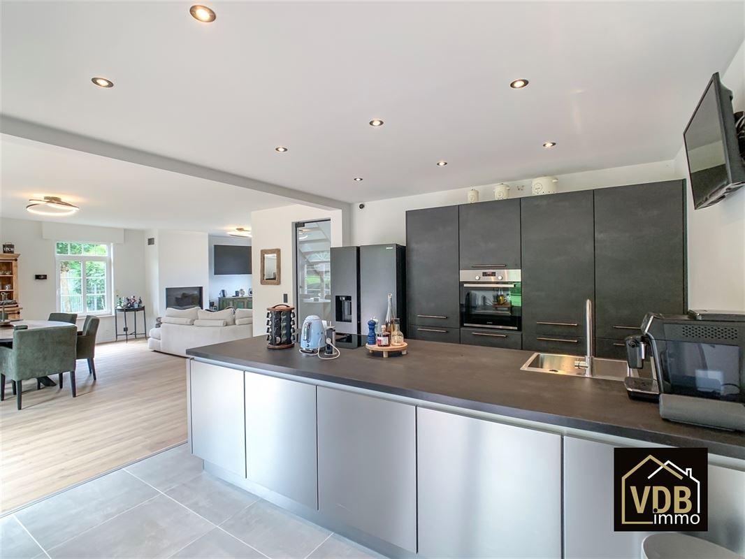 De gelijkvloerse verdieping is gezellig, licht, zeer ruim. De uiterst grote raampartijen met schuifpui laten je meteen genieten van het bijzonder uitzicht op de tuin. De aansluitende - open keuken met eiland is comfortabel en voorzien van alle toestellen en sluit perfect aan bij de leefruimte (samen bruto +- 97 m²) en de geweldige tuin – terras– paviljoen. Een eerste zeer goed uitgeruste badkamer met inloopdouche en dubbele wasbak bevindt zich tussen de keuken en de inpandige garage. Het bureau (eventueel slaapkamer) en het gastentoilet is gelegen bij de inkomhal.