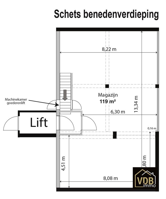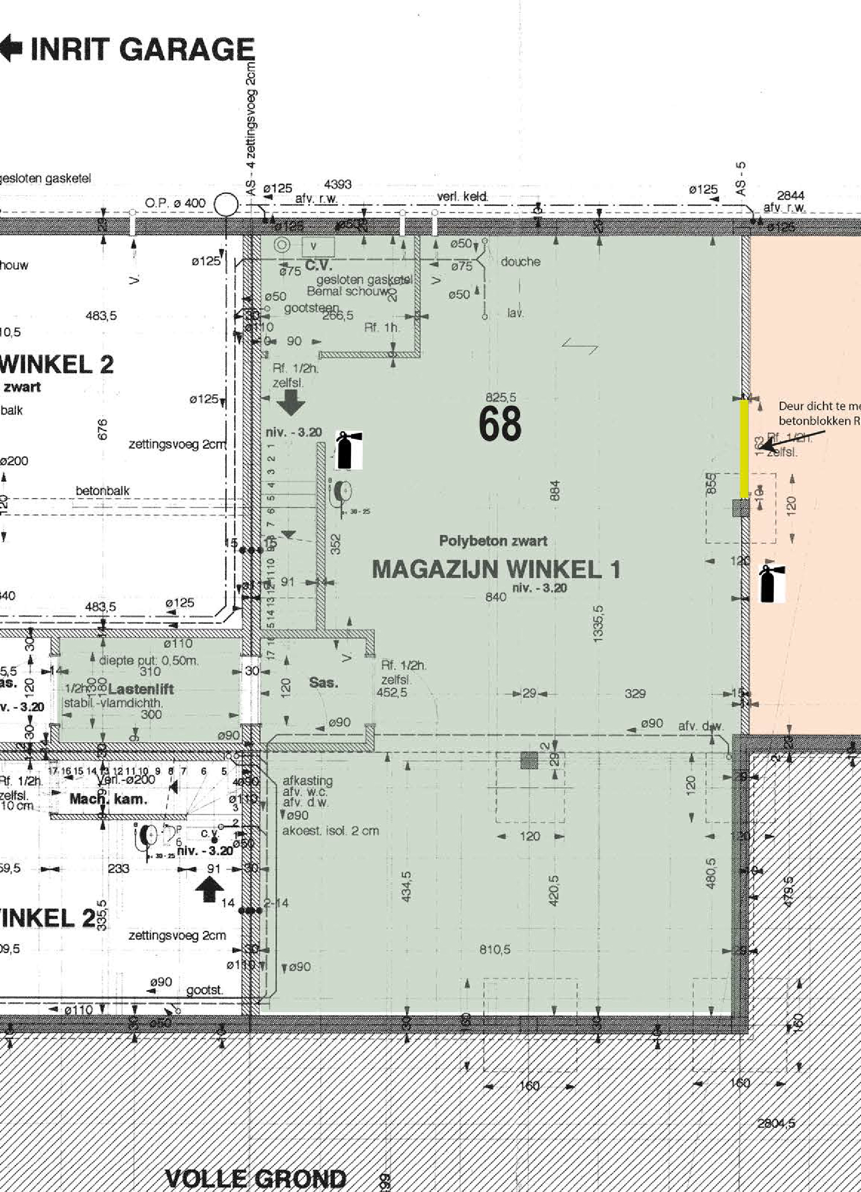 De totale ruimte telt 413 m² (handelsruimte en magazijn) met een etalage van 26 lm. Op het gelijkvloers bevindt zich een grote open ruimte van 294 m² met de goederenlift (300 cm x 130 cm) en de trap naar de kelderverdieping van 119 m². Laden en lossen is voorzien aan de achterzijde van pand.